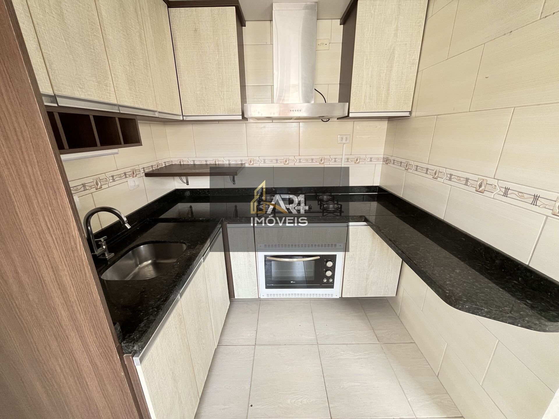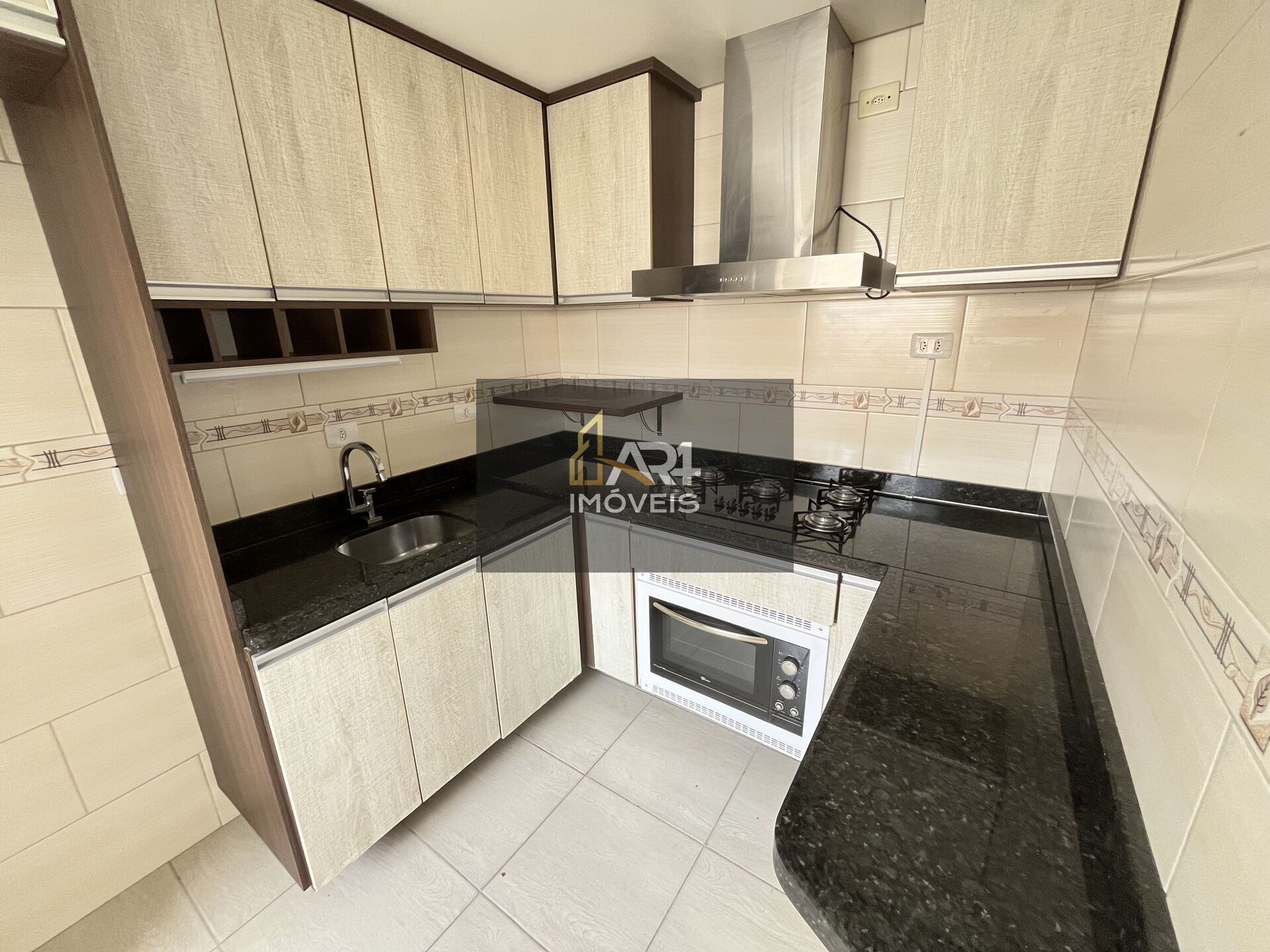Cozinha com móveis planejados, forno, cooktop e exaustor;