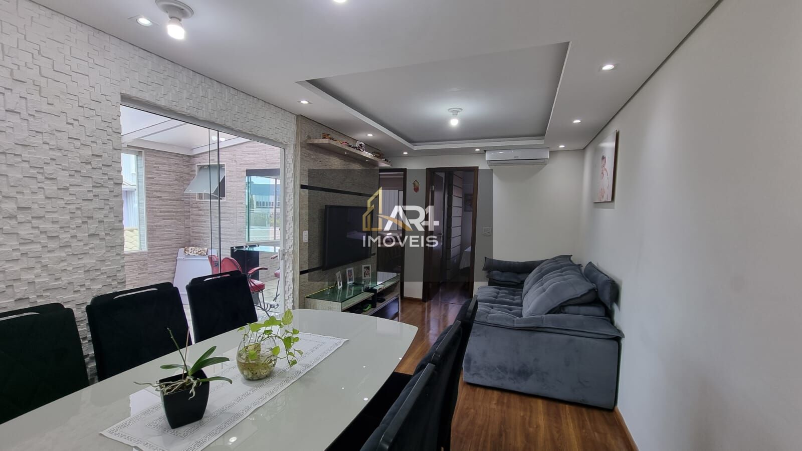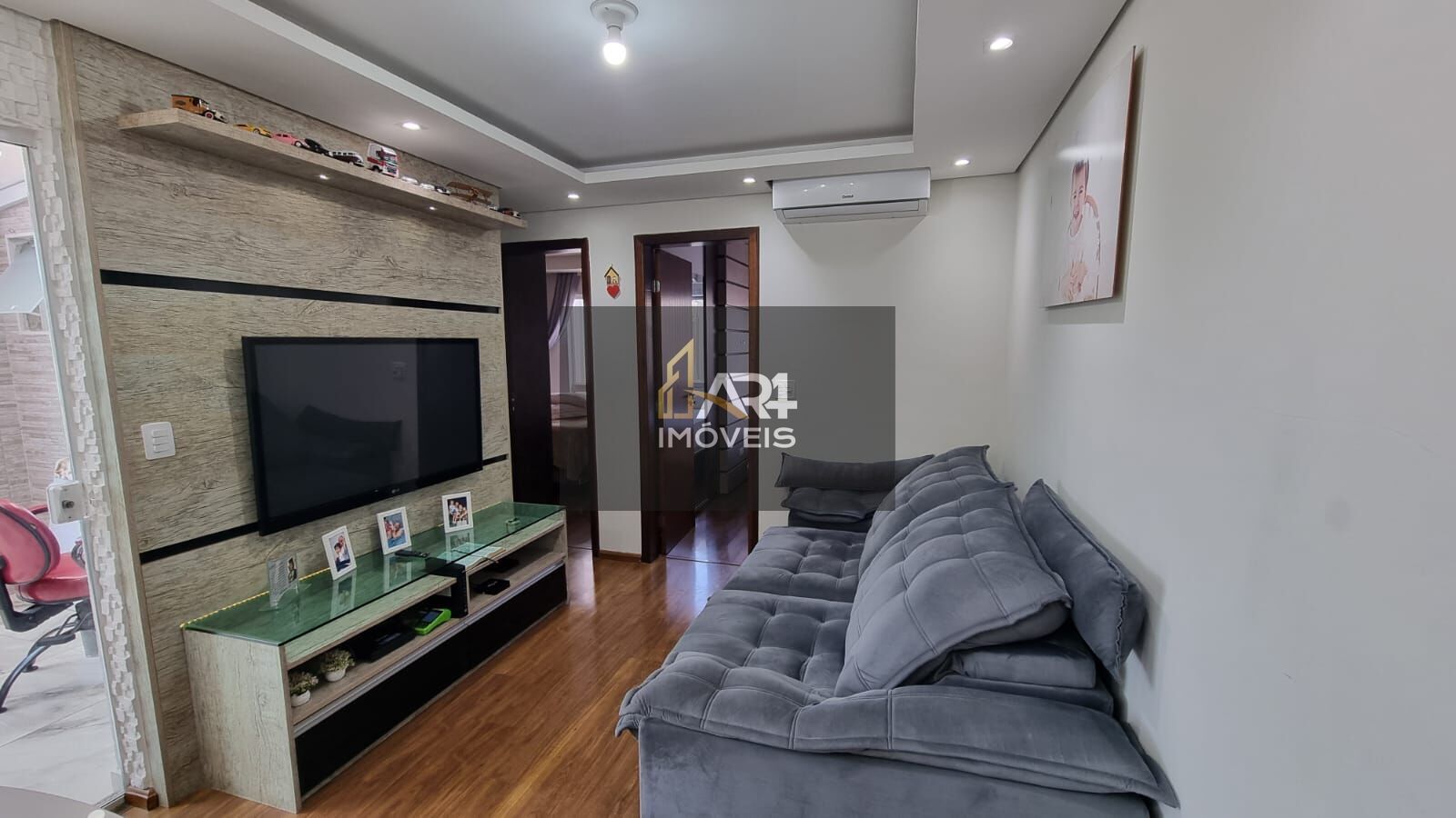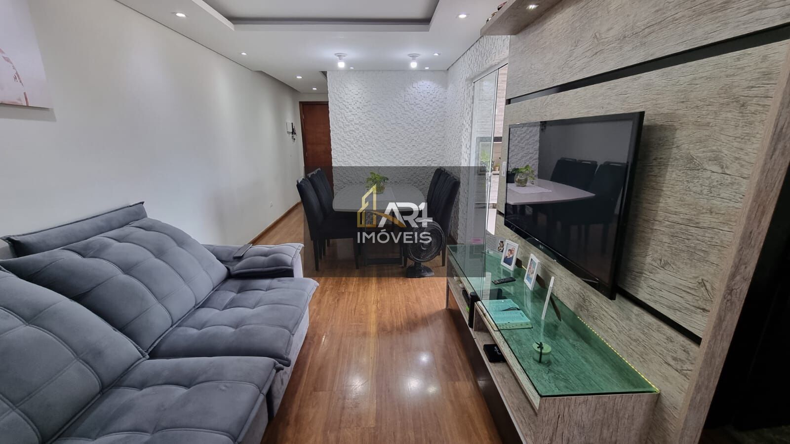 Sala de estar e jantar com painel de tv, bancada e piso laminado em madeira. Nos 2 dormitórios possui móveis planejados, ar condicionado e piso laminado em madeira.