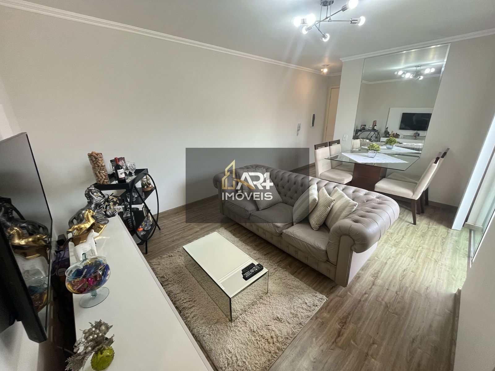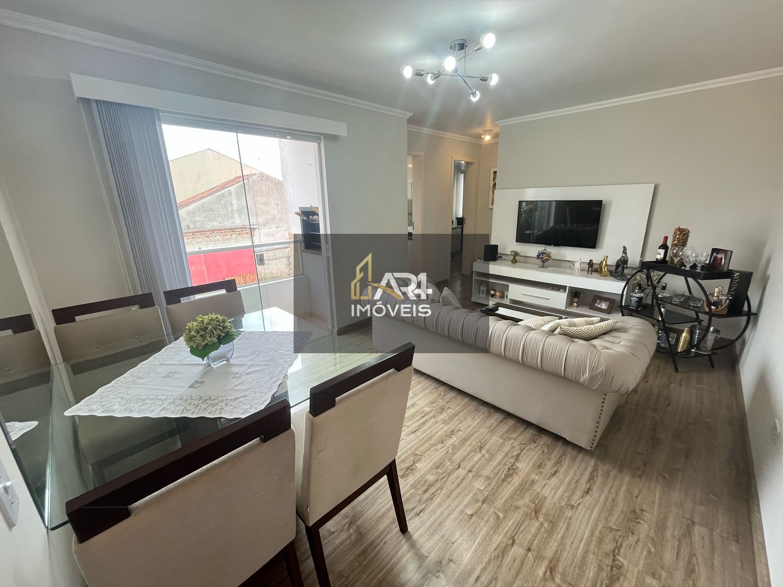 - Ampla sala de estar/jantar bem iluminada e arejada com acesso à sacada com churrasqueira. Na sala permanece o rack, painel de televisão e persianas da porta de acesso à sacada.